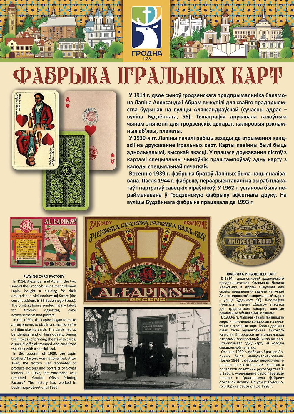 - ул. Буденного (около входа в кафе «Полонез» расположен пюпитр с информацией о здании бывшей Фабрики игральных карт. Современный адрес – ул. Буденного, 56);