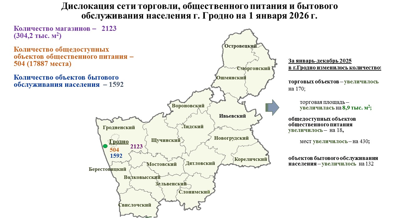 По состоянию на 01.01.2026 года торговое обслуживание населения г. Гродно осуществляют: